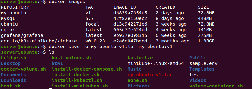 my-ubuntu를 .tar형식으로 압축한 후 ls로 확인해 보면 잘 되있는것을 확인할 수 있다.
