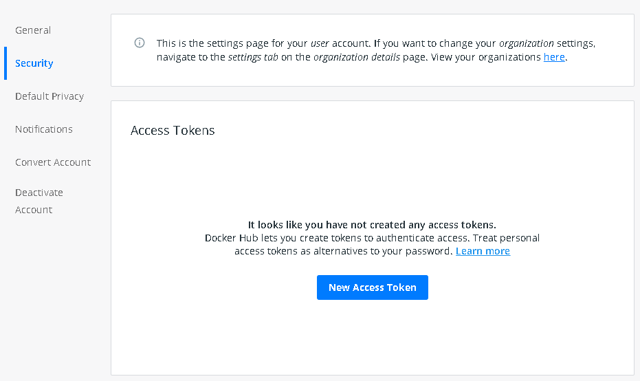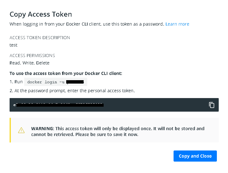 화면에서 나타나듯 엑세스 토큰이 만들어지는데 도커에 로그인 할 수 있는 명령어를 통해 특정 사용자로 진행할 수 있다.