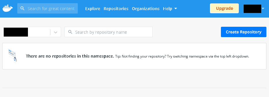 이제 본격적으로 레포지토리를 생성해 보도록 하자. 홈페이지 상단의 Repositories를 클릭한 후 나타나는 화면이다. 아무것도 없는 상태이니 create Repository를 하도록 하자.