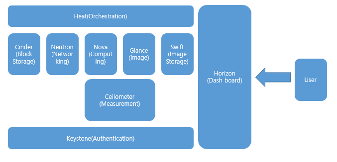 Nova는 가장 핵심이 되는 서비스로서 VM을 생성, 삭제, 기동, 종료 하는 등의 일을 한다. 즉 서버 컴퓨팅 자원을 배분하는 일을 한다. Neutron과 Cinder와 Swift라는 스토리지 서비스가 있으며 Keystone은 사용자의 권한과 인증을 담당한다. Glance는 프로파일 관리 서비스를 해 준다. Ceilometer는 사용량을 측정해 주며 Heat는 인터페이스를 하나로 통합해 준다. 전용 데이터베이스 서비스인 Trove와 Hadoop클러스터와 연결하기 위한 인터페이스 서비스인 Sahara도 있다.