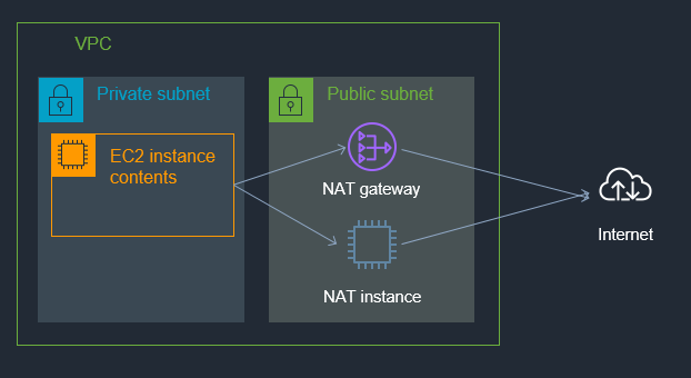 위 그림에서 알 수 있듯 2가지 방법(NAT gateway, NAT instance)를 통해 외부로 요청을 하며 그것을 받을 수 있는데, 이 둘의 차이는 다음과 같다. 먼저 NAT instance는 프라이빗이 외부로 연결되기 위한 하나의 퍼블릭 서버 안에 있는 EC2 서버라고 이해하면 된다. NAT Gateway의 경우 AWS에서 지원하는 우회용 전용 특화 서비스 이다.