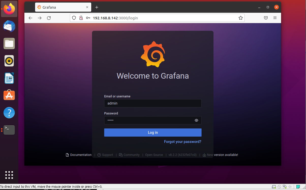 이 후 이 ip를 기반으로 하여 192.168.8.142:3000(3000번 포트)/login을 vmware의 인터넷창에 입력하여 접속하도록 하자. 접속이 잘 되는것을 확인할 수 있을 것 이다. 기본 계정은 admin/admin이다