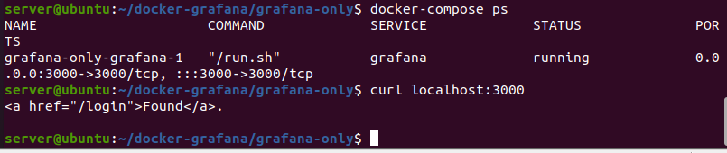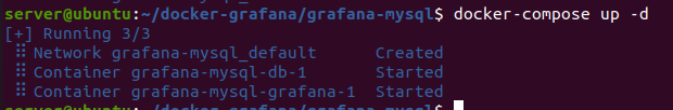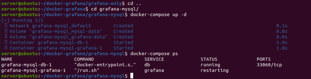 직접 확인했으니 이제 mysql 버전으로 넘어가 보자. 이전 grafana는 down -v 명령어를 사용해 지운 후 mysql 세팅이 된 그라파나를 실행해 보자. 잘 되는것을 확인할 수 있으며 포트번호도 3306번으로 잘 되어있는것을 볼 수 있다.