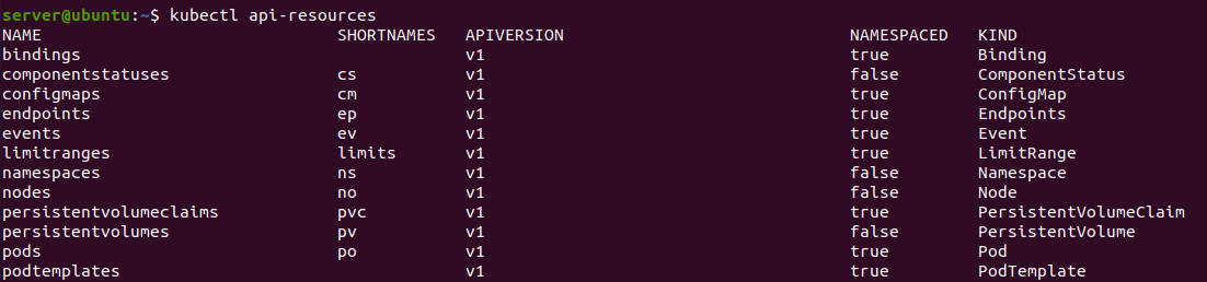 현재 쿠버네티스 클러스터가 지원하는 api리소스 목록들을 전부 출력할 수 있는 명령어 이다. 어떤 리소스를 생성, 관리할 수 있는지 한 번에 확인할 수 있다.