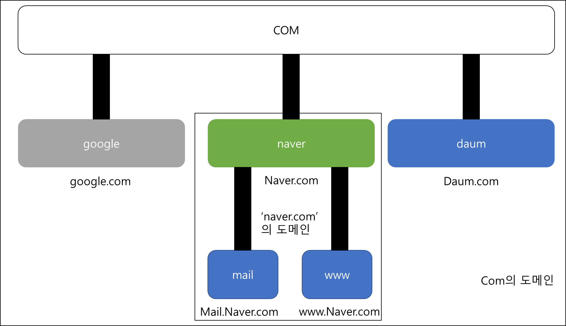 도메인 이름(domain name)은 계층적 구조에 따라서 레가신의 레이블 정보를 가장 왼쪽에 작성하고, 최상위 레벨까지 점( " . " 닷)을 기준으로 하나씩 추가하면서 오른쪽으로 붙이는 형태로 구성된다. 네이버의 매일함 주소는 다음과 같다. https://mail.naver.com/ 그렇다면 이것을 하나하나 분해해 본다면 com이라는 최 상위 도메인에, naver라는 이름의 도메인이 있으며 이 naver하위에 www라는 도메인도 있을 것 이며, mail, cafe등등 네이버와 관련된 하위 도메인 중 mail을 선택한 것 이다.