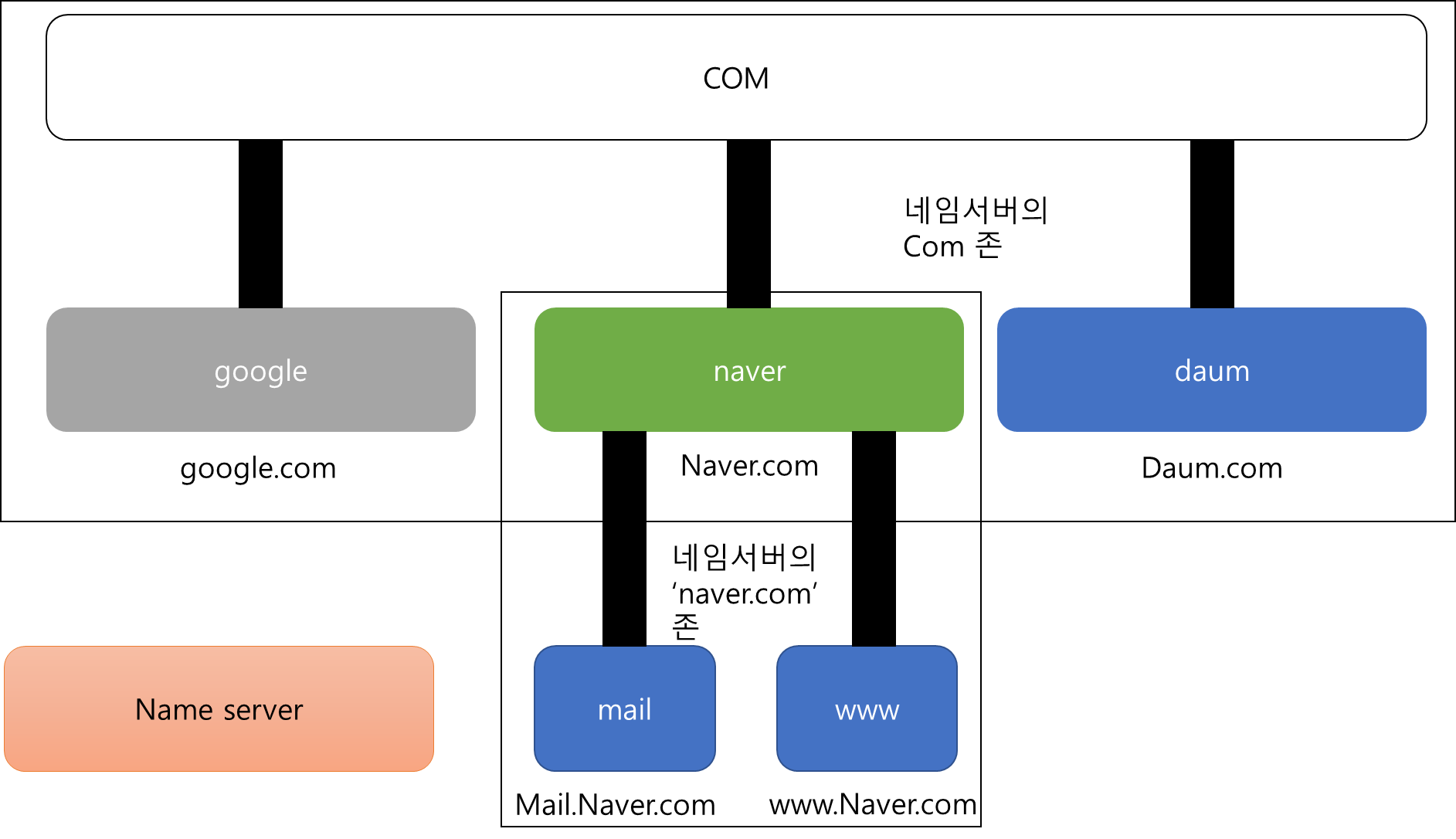 도메인은 하나의 노드가 관리하는 영역이며, 이 노드의 하위 영역을 의미한다. 하지만 zone(존)은 이와 달리 네임서버를 관리하는 영역을 의미한다.