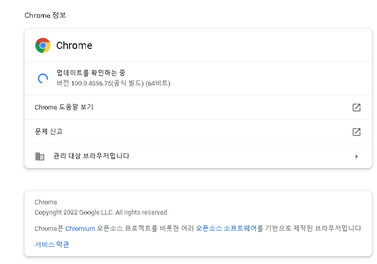 아무튼 아래의 링크를 따라 들어가 보도록 하자. 크롬 버전을 확인할 수 있는 링크이다. 금방 업데이트를 해서 따끈따근한 버전 확인 중 인 필자의 모습이다.