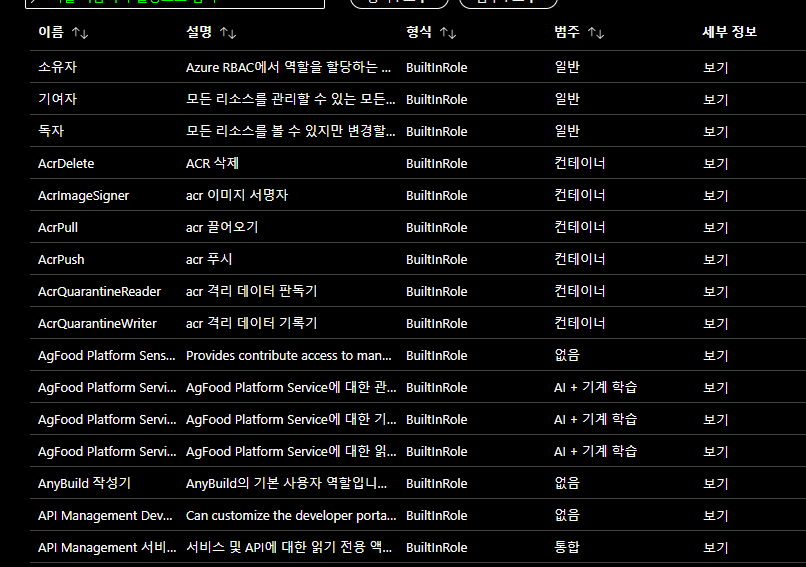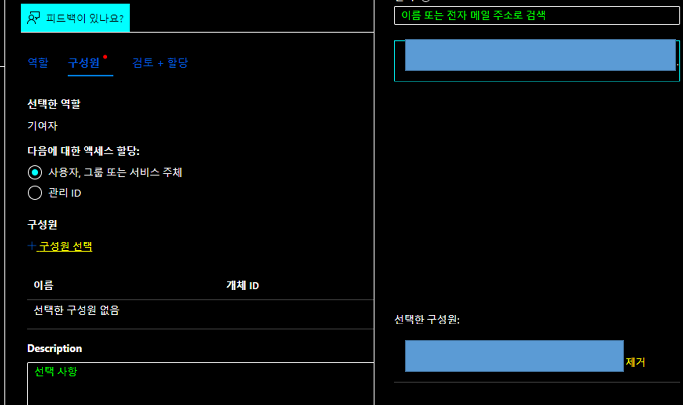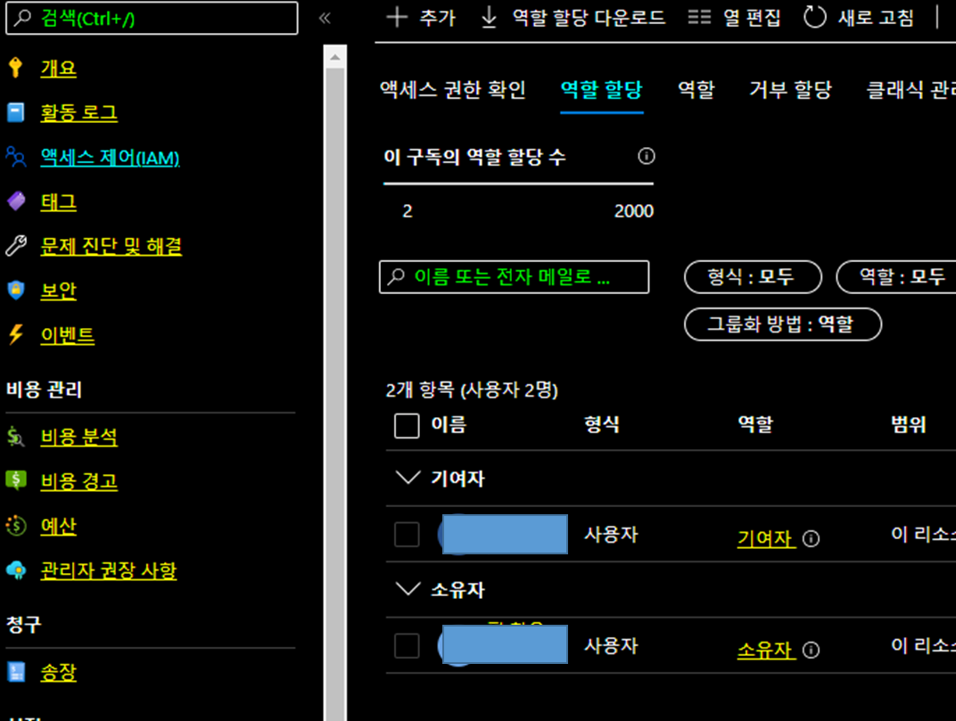 각각의 권한은 아래와 같이 다양하게 존재한다. 기여자 파트를 클릭 후 다음을 눌러 구성원을 선택하도록 하자. 이제 계정이 만들어졌다.