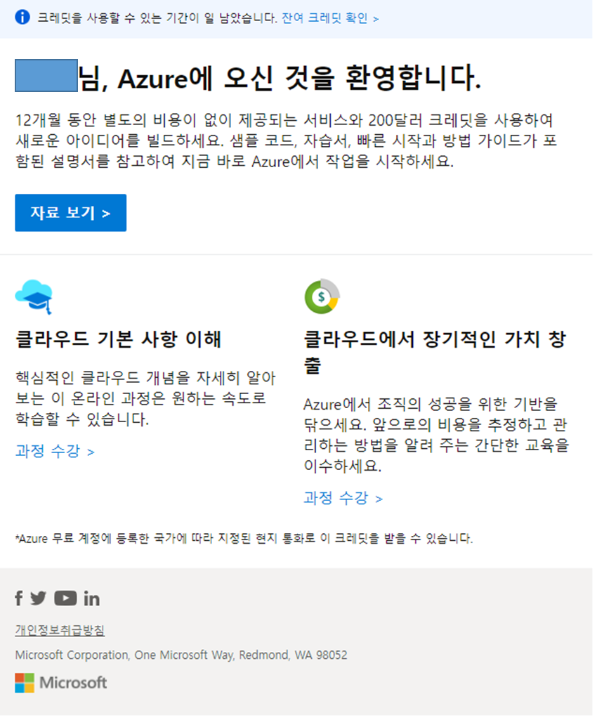 회원가입을 하게 된다면 '구독'이라는 이름을 가진 회원가입을 할 수 있다. 이 구독은 1인당 1회만 가능하며 구독을 해야지 내부 리소스를 사용할 수 있게 된다. 1달동안은 약 200USD의 크레딧을 사용하는 체험판을 사용할 수 있으며 이 후는 1년간 프리티어 계정으로 사용할 수 있게 해 준다.