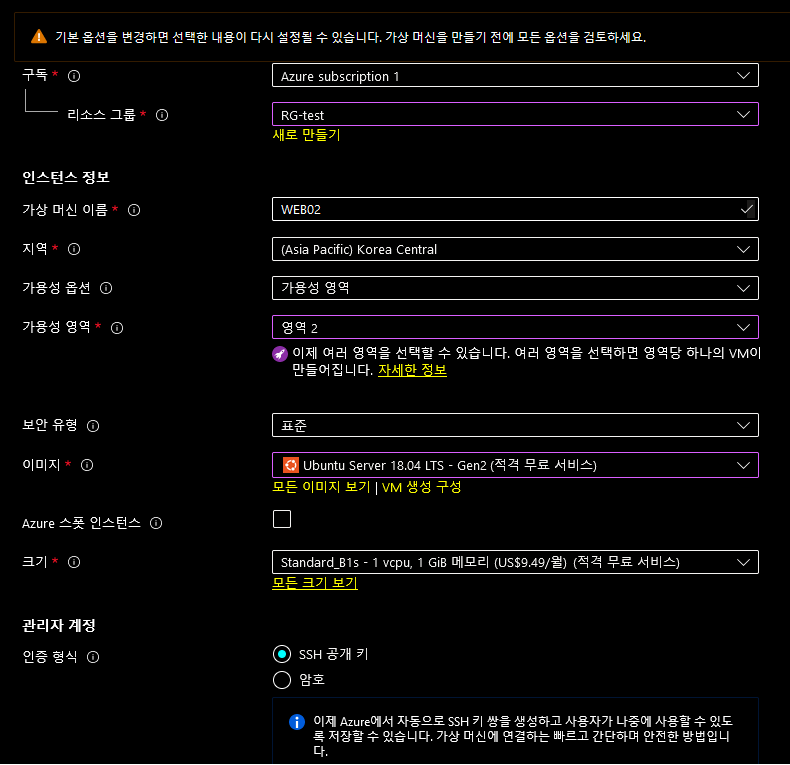 다른 server를 2개 더 만들도록 하자. 가용성 옵션은 영역으로, 가용성 영역은 zone2,3로 지정하자. 이미지는 ubunut18.04gen2, windows server gen2로, 그외의 설정은 이전과 같이 하도록 하자. 조금 텀을 가진 후 실행을 하면 잘 되는것을 확인할 수 있다.