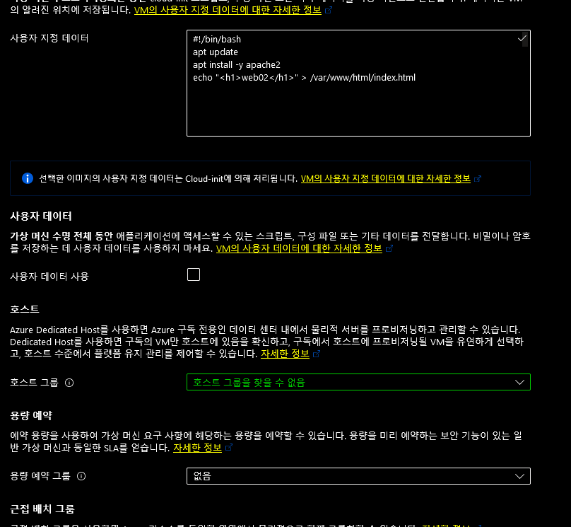 21. 사용자 지정 데이터 및 cloud-init(평소에 사용하던 #!/bin/bash....내용을 기입한다)
