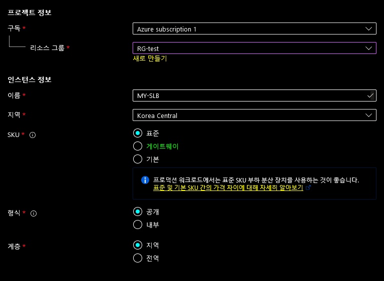 SLB앞단의 Frontend ip를 생성 후 backend pool을 지정하도록 하자. 간단히 slb의 이름을 지정한 후 Frontend ip를 구성하자. 기존의 ip들은 연결할 수 없으니 새로 만들기 버튼을 클릭하여 설정하자.