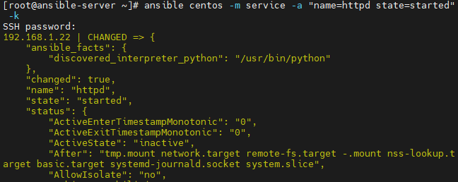 # ansible centos -m shell -a "firewall-cmd --permanent --zone=public --add-service=http" -k