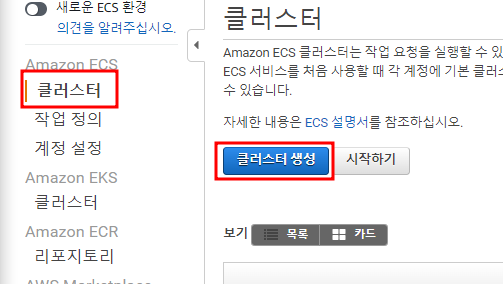 서비스와 클러스터는 굉장히 추상적인 개념이라고 할 수 있다. 하지만 task가 구성되고부터는 점차 구체적으로 확인할 수 있게 된다. 일반적으로 AWS에서는 Ec2내부에 컨테이너를 생성하고, 이런 EC2를 묶어서 하나의 서비스로 만든다. 이것을 하나의 Cluster라고 이야기한다. 하나의 ECS를 생성해 보도록 하자.