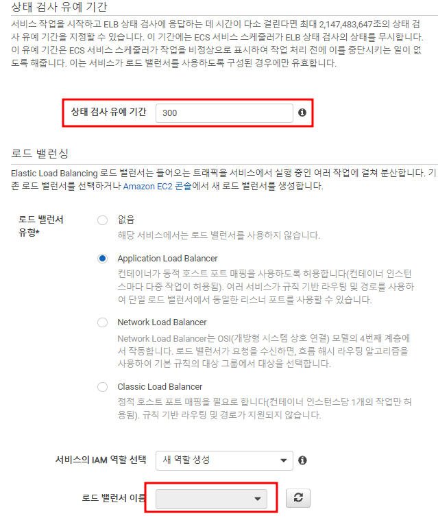 상태 검사 유예 기간을 설정할 수 있다. 0초로 지정하게 된다면 인스턴스가 만들어질때(업데이트 등)문제가 발생할 수 있으니 기본값인 300초를 주도록하자. ALB가 만들어져있지 않는데, ECS를 ALB로 묶도록 하자.