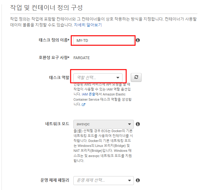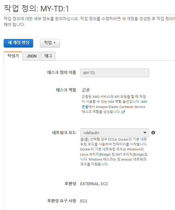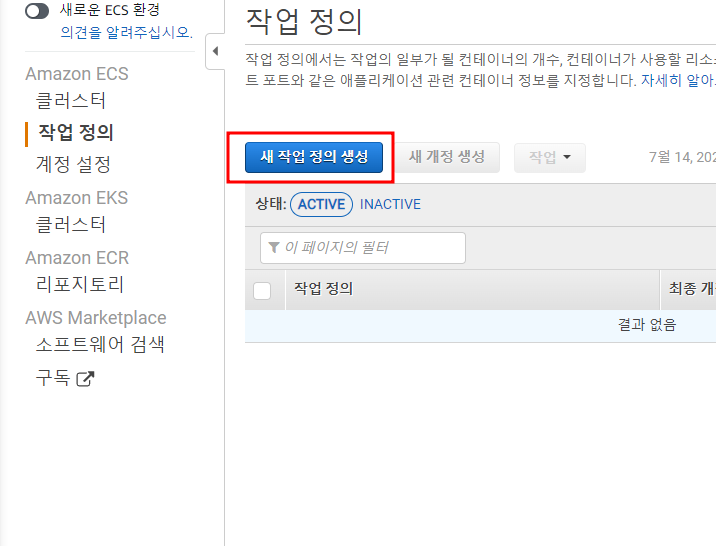 먼저 작업 정의 파트로 들어가 새 작업 정의 생성을 클릭하자.
