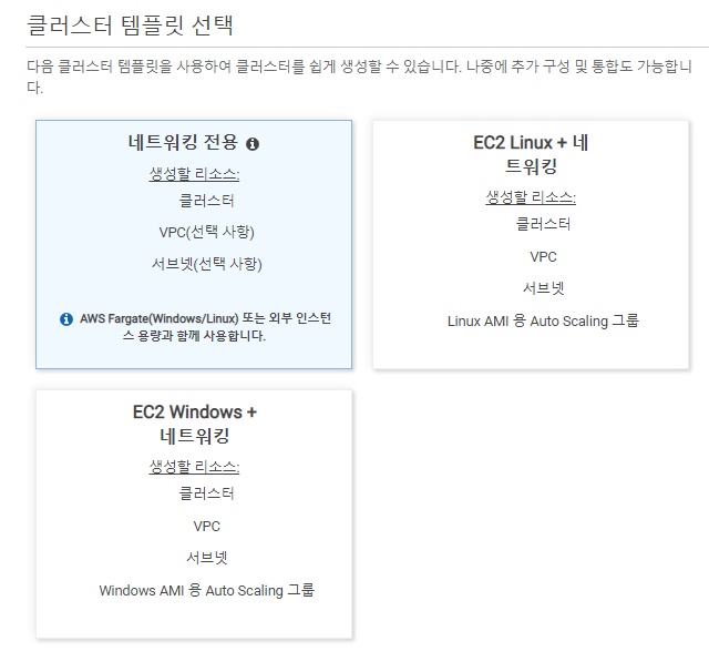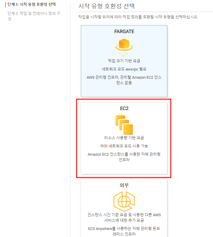 설정하고 싶은 호환성을 선택하도록 하자. FARGATE와 같은것을 선택할 수 는 있지만 간단하게 EC2를 선택해 보았다.
