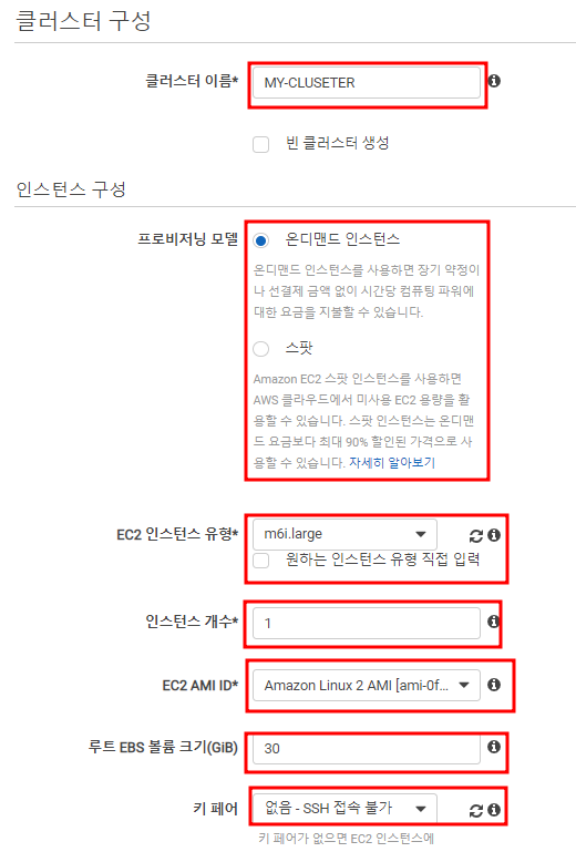 클러스터의 이름을 선택한 후 요금을 선택한다. 온디맨드 인스턴스와 스팟 중 택일할 수 있다.