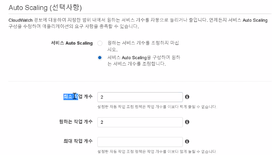 이 후 오토스케일링을 생성해두도록 하자. 작업에 대한 갯수를 부여할 수 있다.