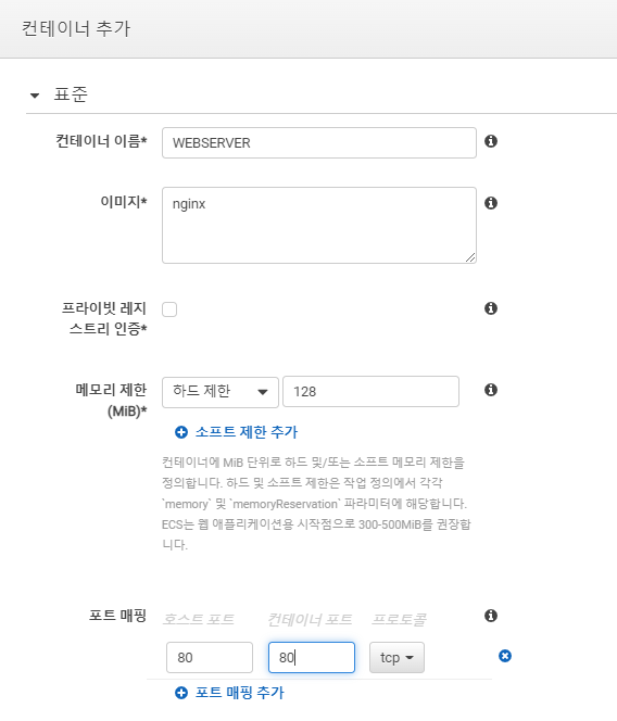컨테이너의 이름을 설정하고 이미지를 지정한다. 이미지의 경우 본인이 사용하고 싶은 엔진을 선언하면된다.