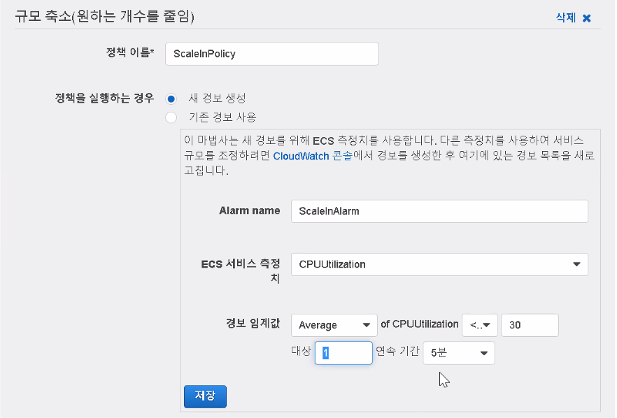 Cloudwatch 대시보드를 가지 않더라도 콘솔에서 추가할 수 도 있다. 5분이내에 30이라는 cpu값 이하가 날 경우 경보 임계값을 나타낸다. 라고 설정했다.