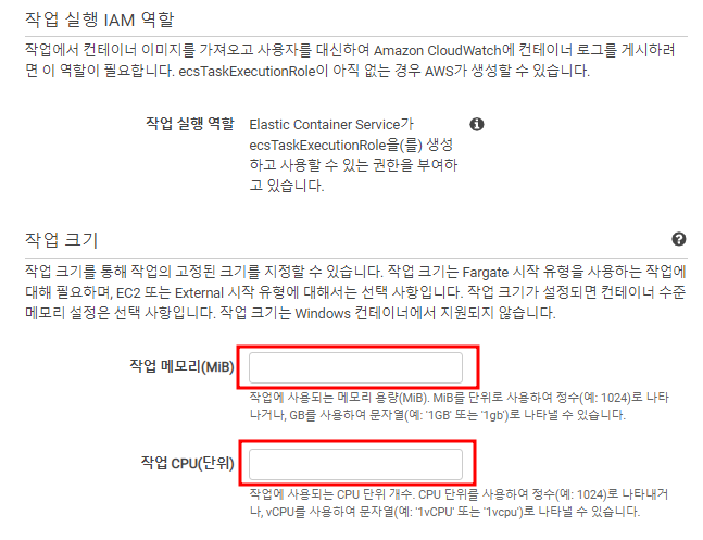 IAM역할과 작업크기를 설정할 수 도 있다. 본인이 원하는 PC Resorce를 설정할 수 있다. 도커 컨테이너의 크기를 정하는것과 같은 역할을 한다.