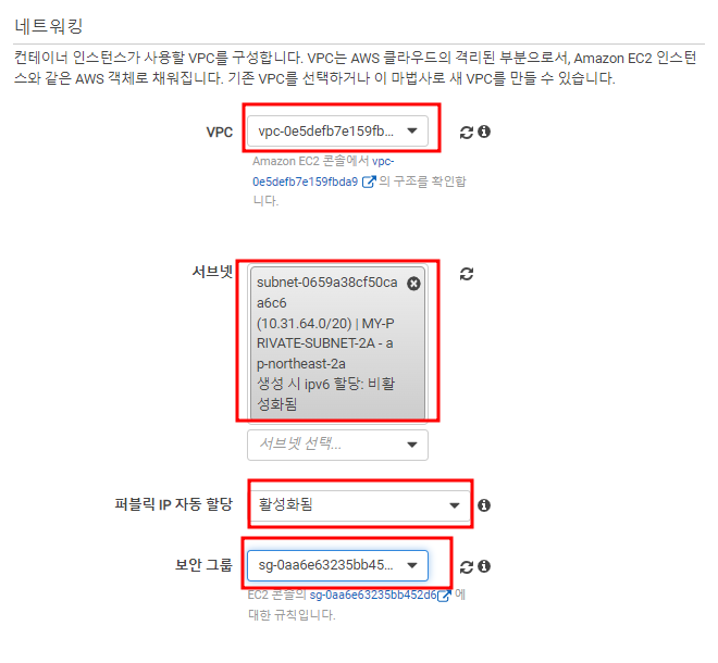 이 후 네트워킹을 설정하도록 하자. VPC와 Subnet, ip할당과 보안그룹을 지정하도록 하자.