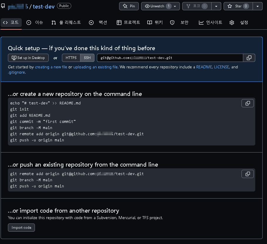 $ git remote add origin https://github.com/계정명/test-dev.git