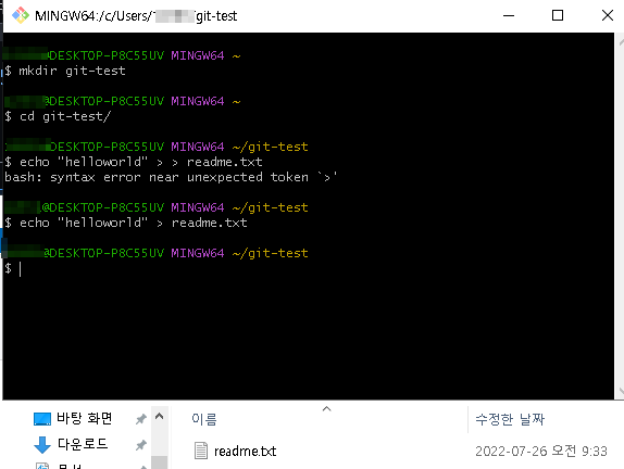 상단의 git bash아이콘을 클릭하면 아래와 같은 창이 나타난다. 이 창은 앞으로 git에서 활용할 수 있으며, 하나의 작은 리눅스와 같다고 보면 된다. 리눅스 명령어를 활용해 git test라는 폴더와 readme.txt라는 파일을 생성했다. 이때 파일이 저장되는 경로는 "C:\Users\'사용자가 지정한 윈도우 계정명'"에 보통 저장된다.