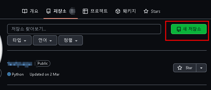 이곳에서 소스코드를 저장할 수 있다. 새 저장소를 클릭후 리포지토리의 이름을 지정하도록 하자.