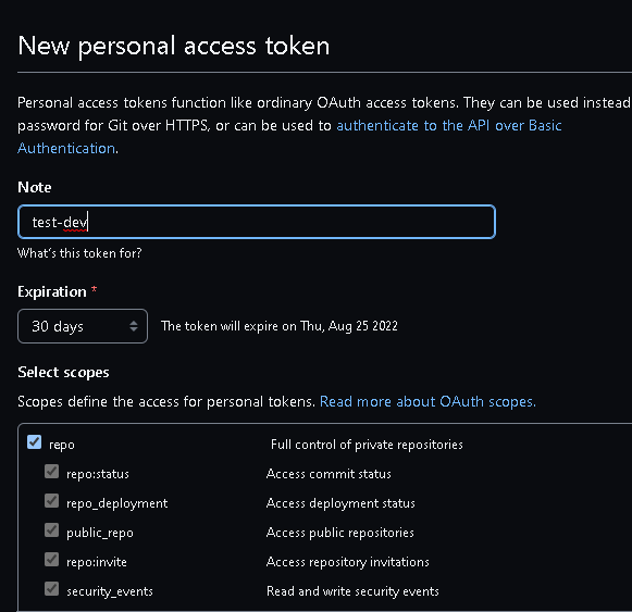 토큰의 이름과 다양한 권한을 기입할 수 있다. 가볍게 repo만 추가하도록 하자.