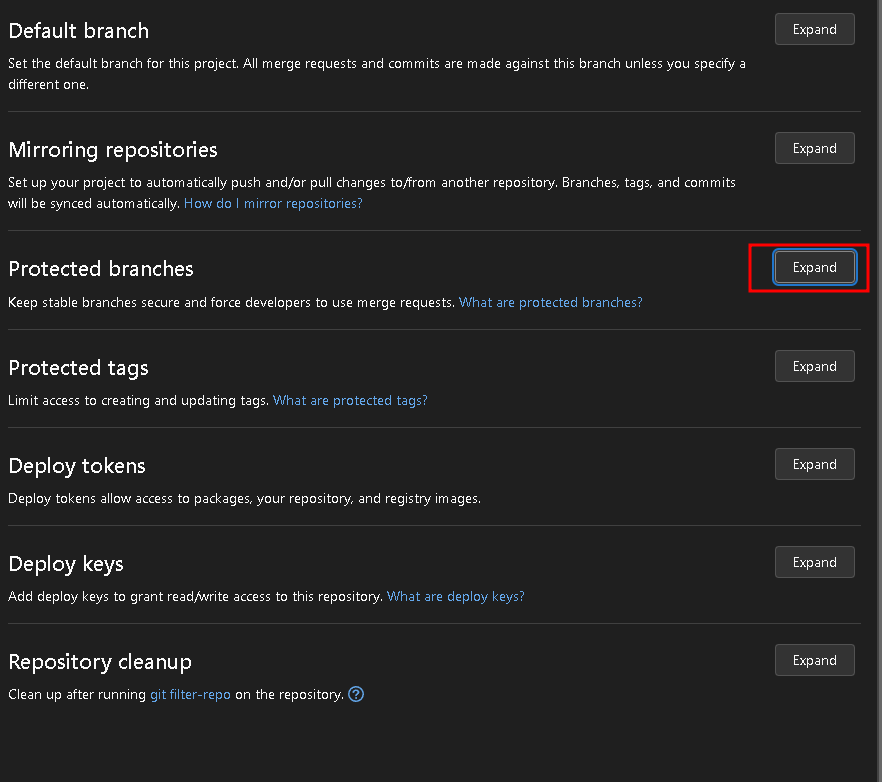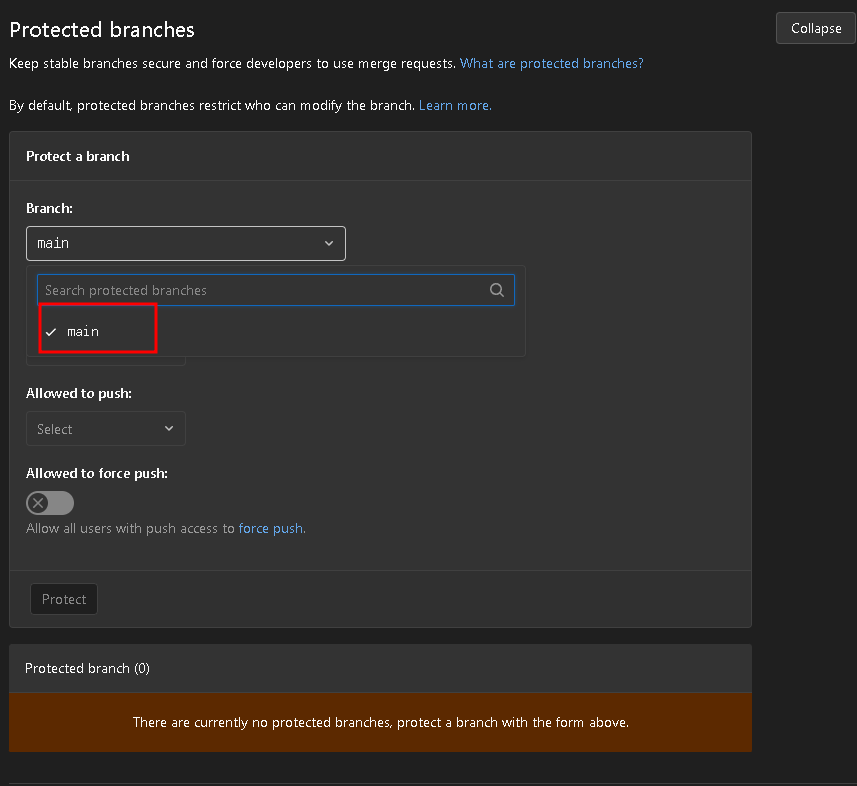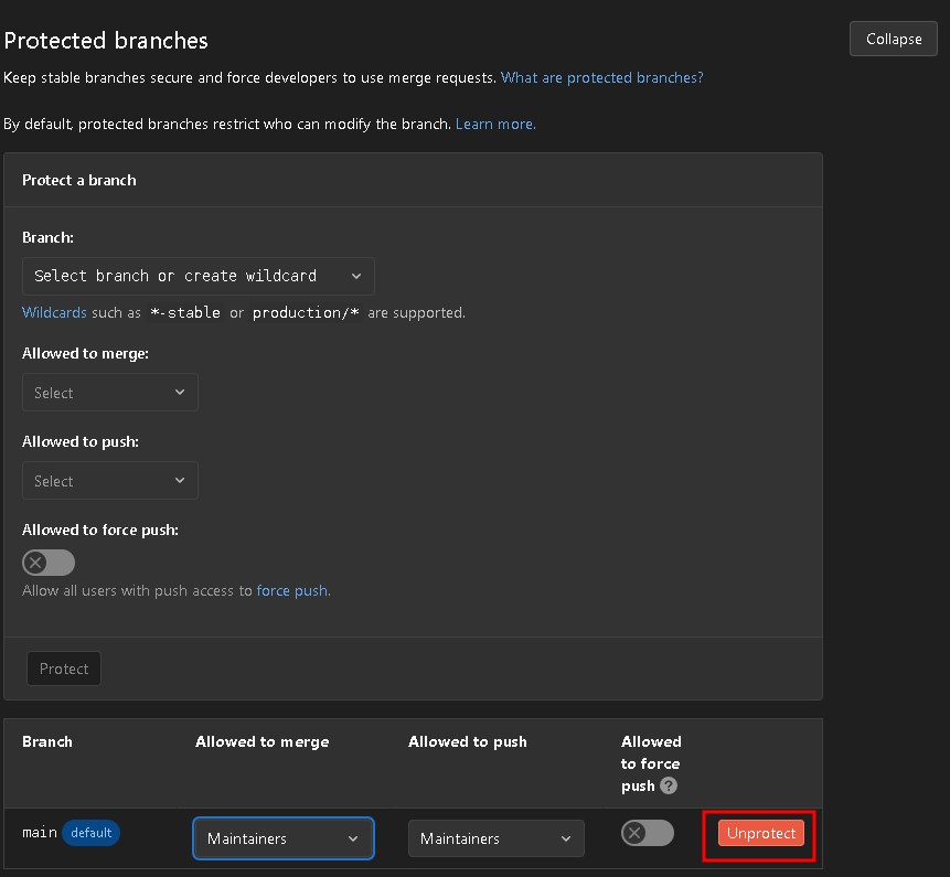 하단의 unprotect를 개방한 후 main이라는 branch를 체크하도록 하자. 이 작업을 수행하지 않으면, 프로젝트에 대해 보안이 걸려서, 업로드를 자유롭게 할 수 없다.