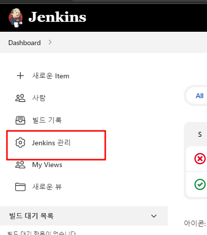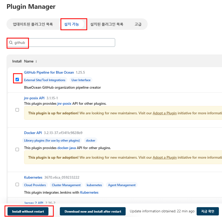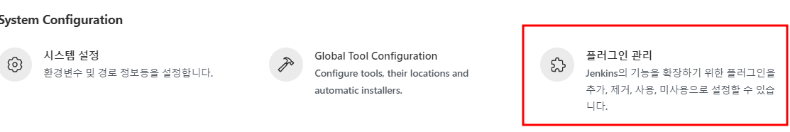 이제 플러그인들을 설치해 보도록 하자. 대쉬보드 => jenkins관리 => 플러그인 관리 순서로 접근하면 된다.