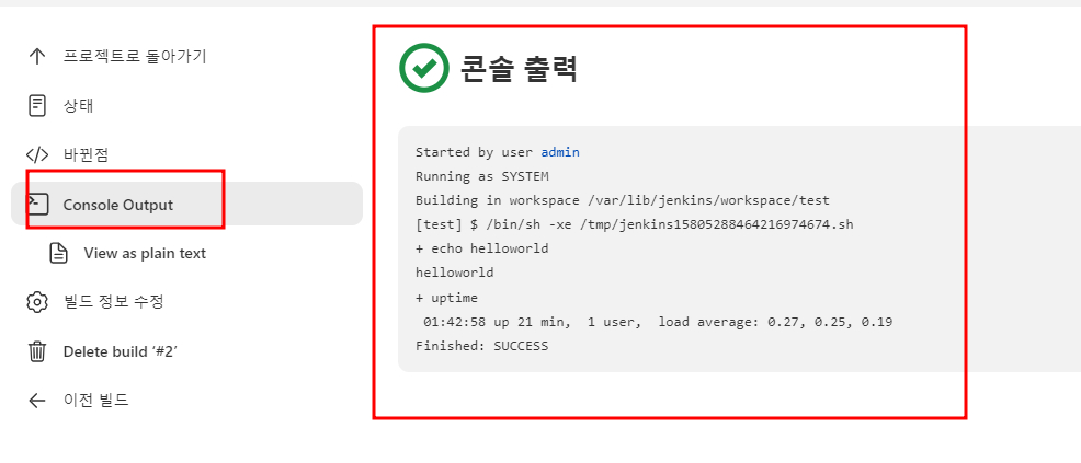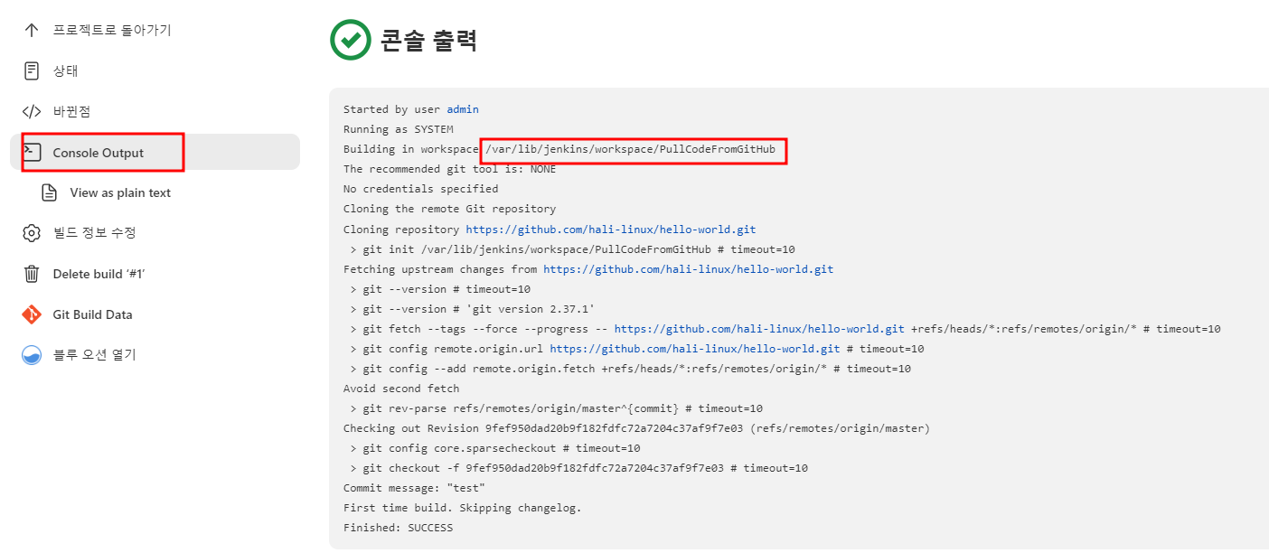 Git Hub를 위한 간이 프로젝트를 생성하고 설정하도록 하자. 특별히 추가할 것은 없으며 소스 코드 관리 => git부분에 소스 코드를 하나 기입하도록 하자. 이 후 지금 빌드 버튼을 클릭하면 잘 실행되는것을 볼 수 있다.