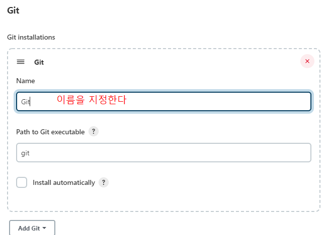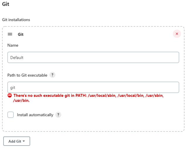 이 후 CLI창에서 GIT 을 설치한 후 Global Tool Configuration에 접근해, Jenkins 전역에 영향을 주도록 하자. git을 설치하지 않은 상태에서 Global Tool Configuration에 접근하면 왼쪽과 같은 애러가 나타난다.