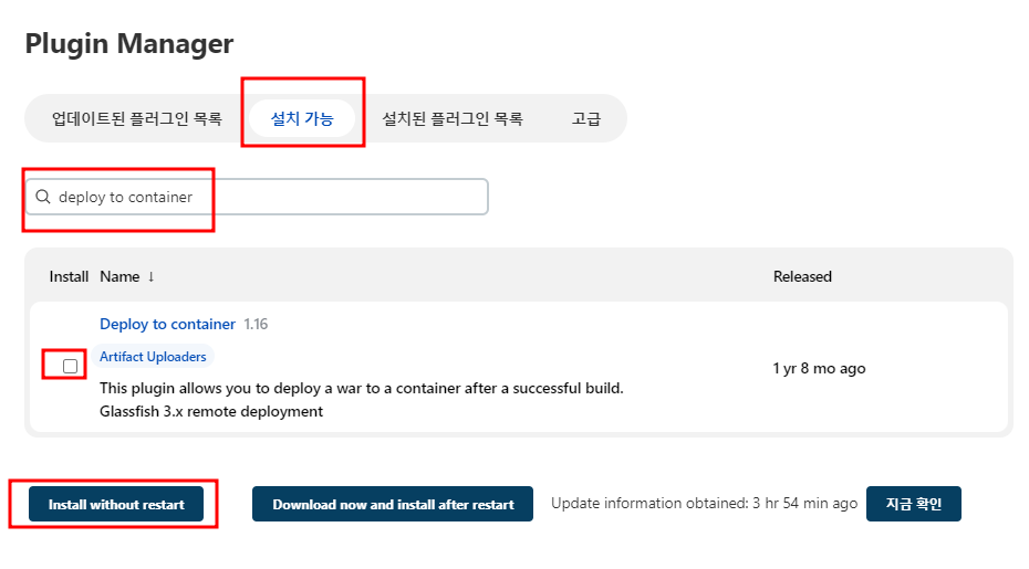 이 후 deploy to container를 입력해 플러그인을 다운로드 받도록 하자.