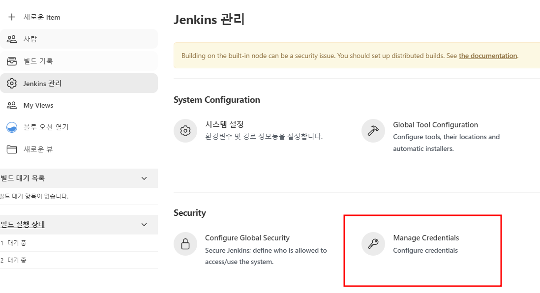 익숙한 집사님이 나타난다. jenkins를 클릭한 후 Global Credentials로 들어가도록 하자.