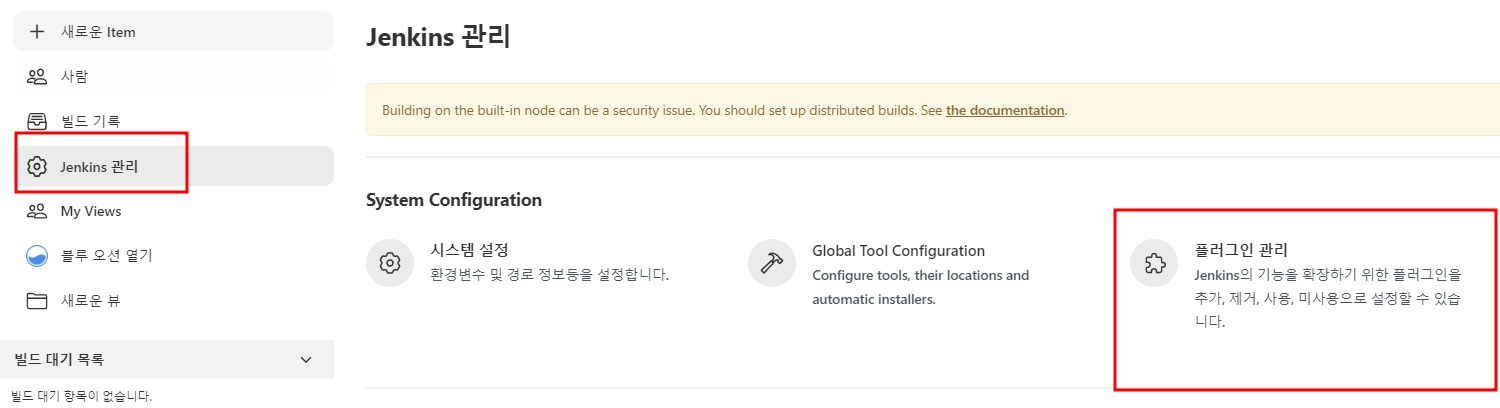 이 전 시간에 만들었던 젠킨스와 톰켓을 연동해 보도록 하자. 먼저 젠킨스로 접근한 후 플러그인 관리로 들어가자.