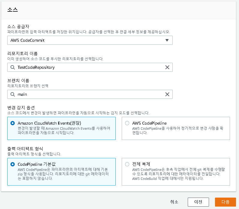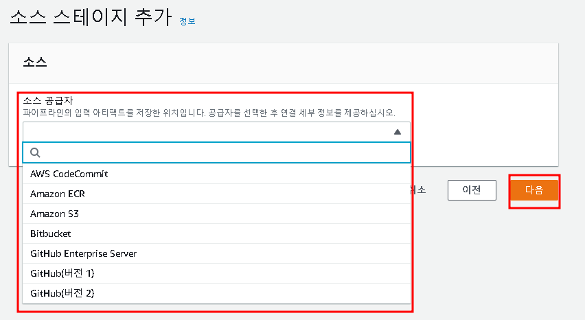 CodeCommit, ECR, S3 등의 다양한 소스 공급자가 있다, 내부 코드를 파악하기 위함이니 이 페이지에서는 CodeCommit을 활용하도록 한다.