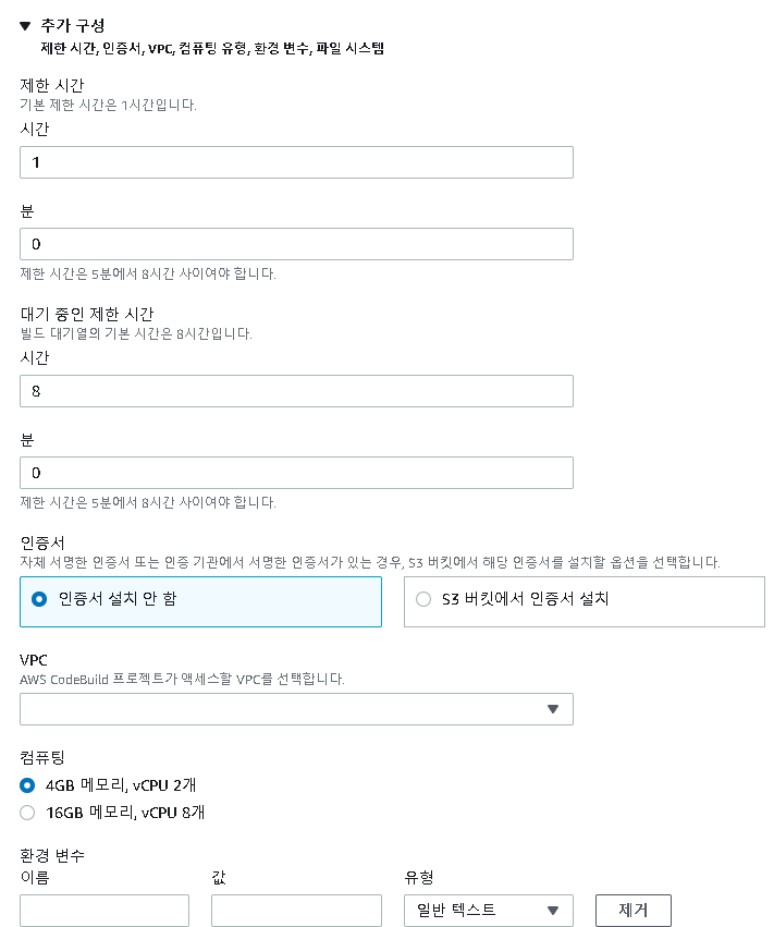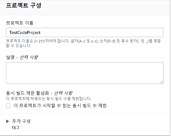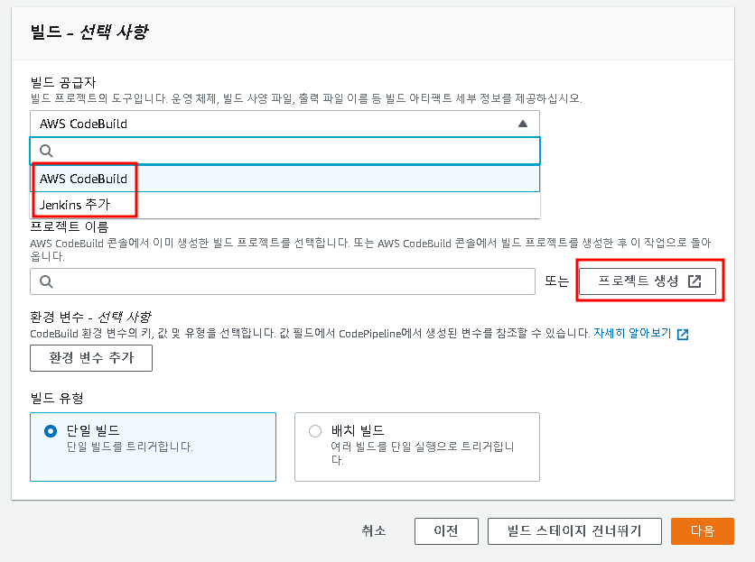 코드빌드를 사용할 것이기에 파이프라인 빌드 단계를 설정할 수 있다. 젠킨스를 활용할 수 도 있으며 순수 AWS기능을 활용해서도 설정할 수 있다. 반드시 리전값을 설정해야하며, AWS 코드 빌드내에서 프로젝트를 순서대로 설정해야한다.