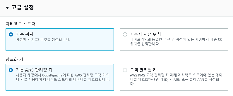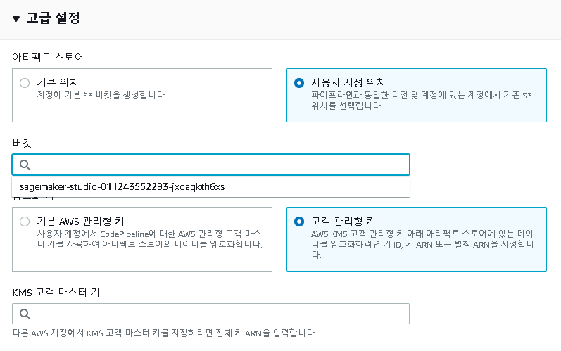 고급설정에서는 아티펙트 스토어의 역할을 하는 S3와 암호화키를 설정할 수 있다. 기본 위치를 선택하게 된다면, 새로운 S3를 생성해 주며, 사용자 지정 위치를 선택할 시, 기존에 만들어둔 S3중 하나를 택일해서 사용할 수 있다. 암호화키도 마찬가지로 AWS에서 관리해주는 관리형키를 선택할 것인지, 고객이 관리할 수 있는 관리형 키를 선택할 것인지 선택할 수 있다.