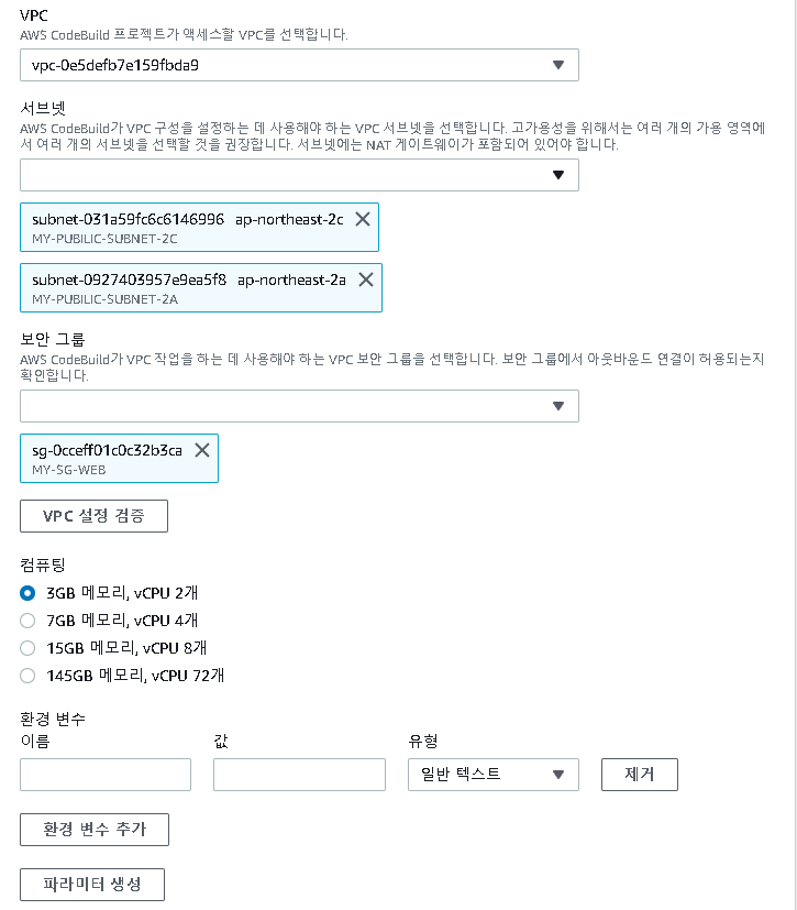 또한 구체적인 VPC의 환경을 설정할 수 도 있다. 새로 업로드를 해야한다면 생성하고, 기존의 VPC를 사용할 것이라면 기존것을 체크하도록 하자.(코드실행이기에 서브넷은 반드시 프라이빗 으로 엑세스하는것이 원칙이지만 실습관계로 퍼블릭을 설정했다.)