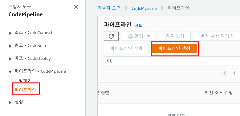 콘솔창에 접근한 후 CodePipeIine을 검색한 후 아래창에서 파이프라인을 생성해 보도록 하자.