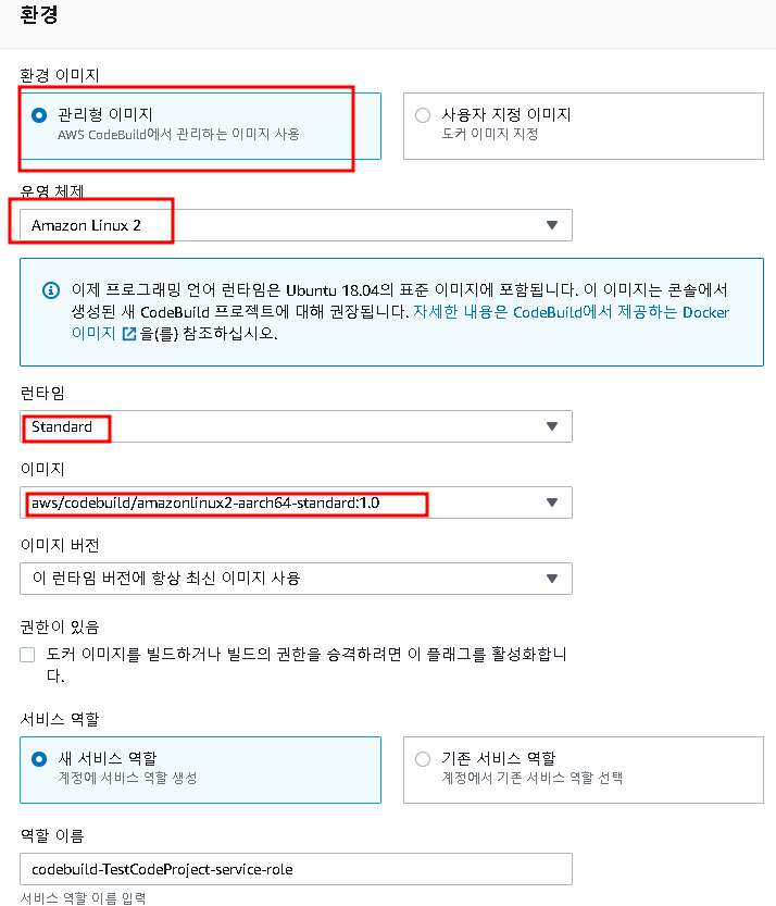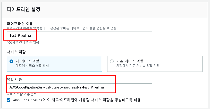 파이프라인에 대한 이름을 지정하면 "자동"으로 역할이름이 할당된다. 새로운 서비스 혹은 기존 서비스 역할 중 개발자가 필요한 것에 맞게 설정하면 된다.