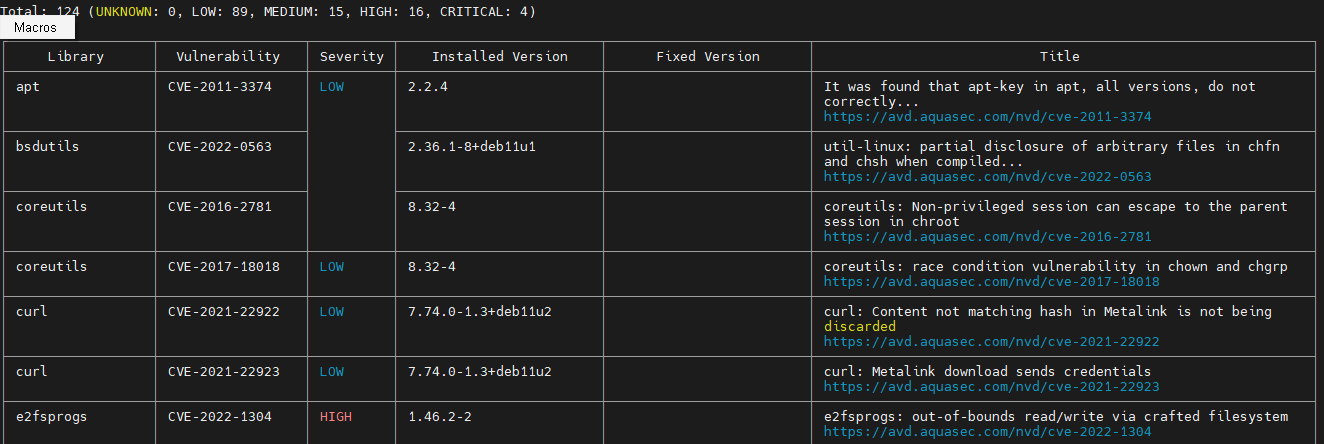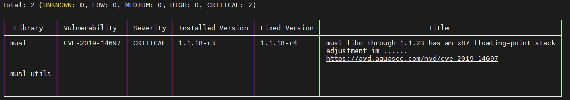 아래의 화면은 trivy image 명령어를 통해 스켄이 완료된 화면이다.