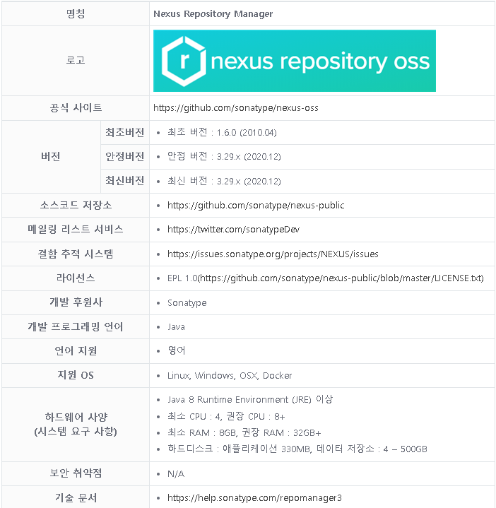 . |Nexus Repository Manager|https://github.com/sonatype/nexus-oss| 최초 버전 : 1.6.0 (2010.04) | 안정 버전 :...