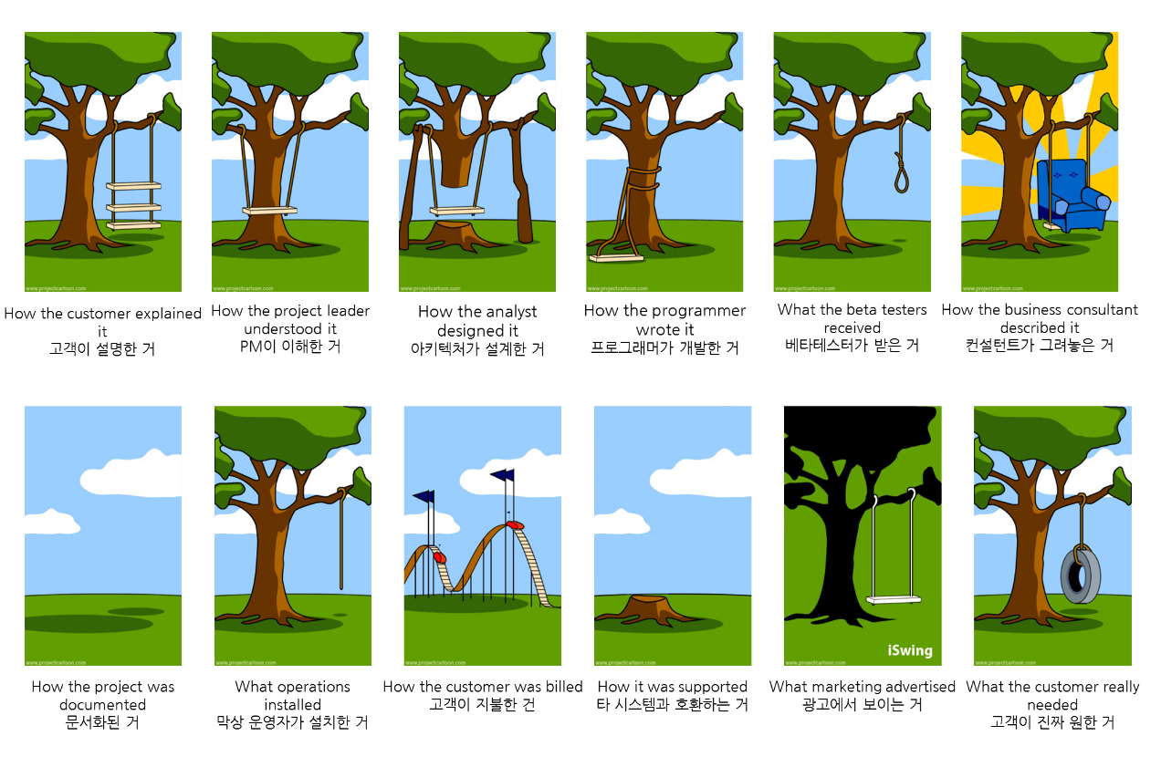 이 상황을 한 마디로 설명하면 '개판 5분전'이라고 설명하기 딱 좋을 상황이다. 고객은 단순한 개념을 요구하고 그것을 설명했지만 PM, 개발자, 아키텍처 등등 모두가 이해하고 받은 자료는 다르다.