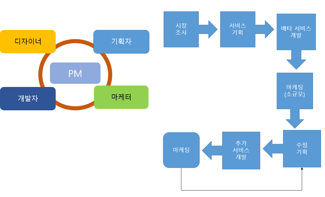 만들어진 팀을 기반으로 먼저 어떤 서비스를 만들 것 인지에 대한 시장조사를 하게된다. 여기서 획득한 자료를 바탕으로 하여 구체적인 서비스 기획을 하고 베타 서비스를 개발하게 된다. 베타를 기반으로 소규모 마케팅을 실행한다. 마케팅을 실시하게 되면 다양한 피드벡이 오게되고 이 정보를 바탕으로 수정 기획을한다. 여기서 획득한 자료를 바탕으로 하여 다시 시장에 마케팅을 선보인다. 여기서 획득된 자료를 바탕으로 반복적으로 수정, 기획, 서비스 개발, 마케팅이 서비스가 종료되는 시점까지 순환이 된다.