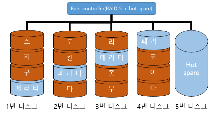 RAID 5는 기본적으로 패러티(parity)연산 기법을 통해 특정 디스크가 손상되었을때 이것을 보완하도록 한다.
