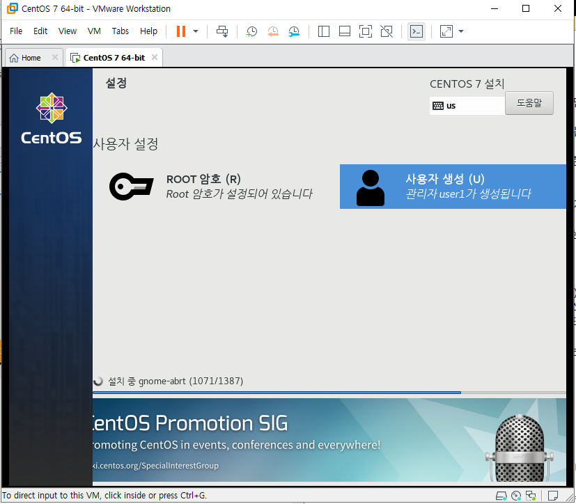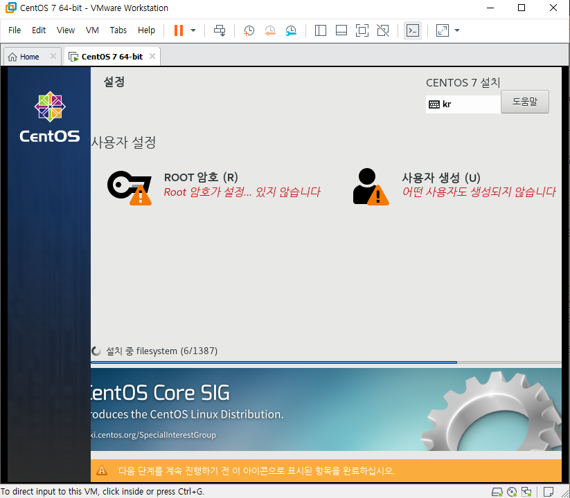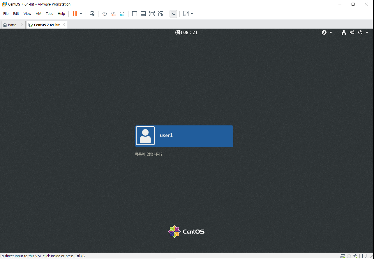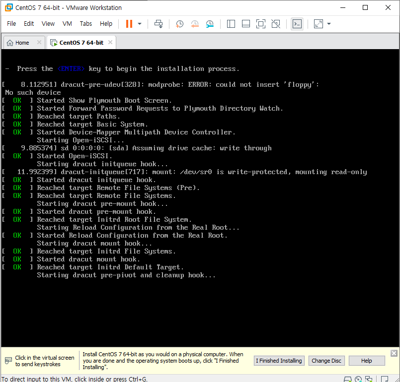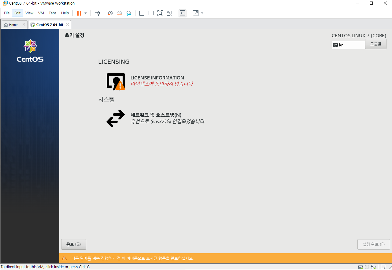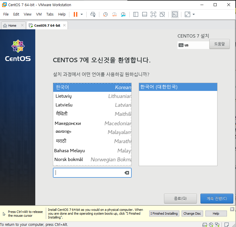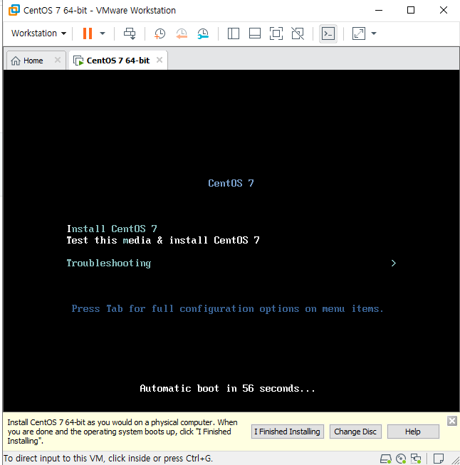 이전시간에 완료된 centos7를 최초로 실행시키면 다음과 같은 화면이 나타난다. vmware를 클릭 후 키보드로 상하를 선택할 수 있다. install centos7을 선택 후 엔터를 눌러주자. 이때부터는 vmware의 창안과 밖은 구분된 공간임을 잊지말자.